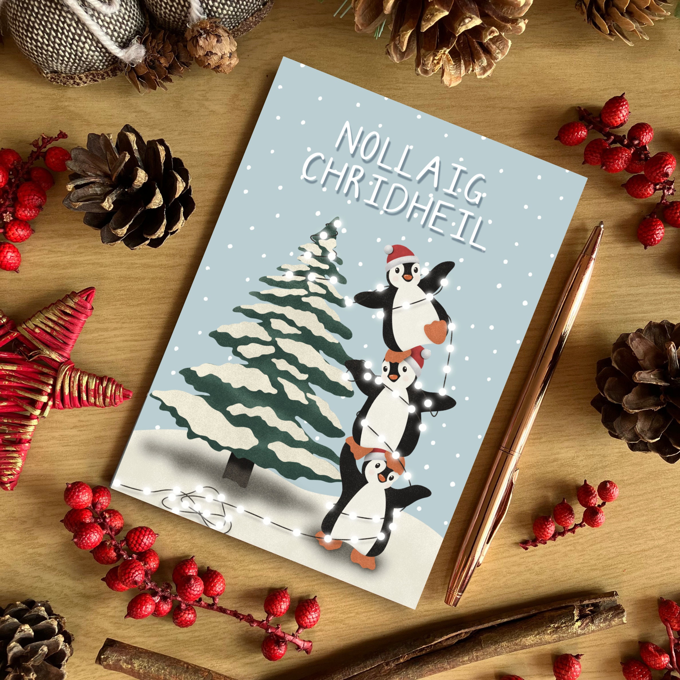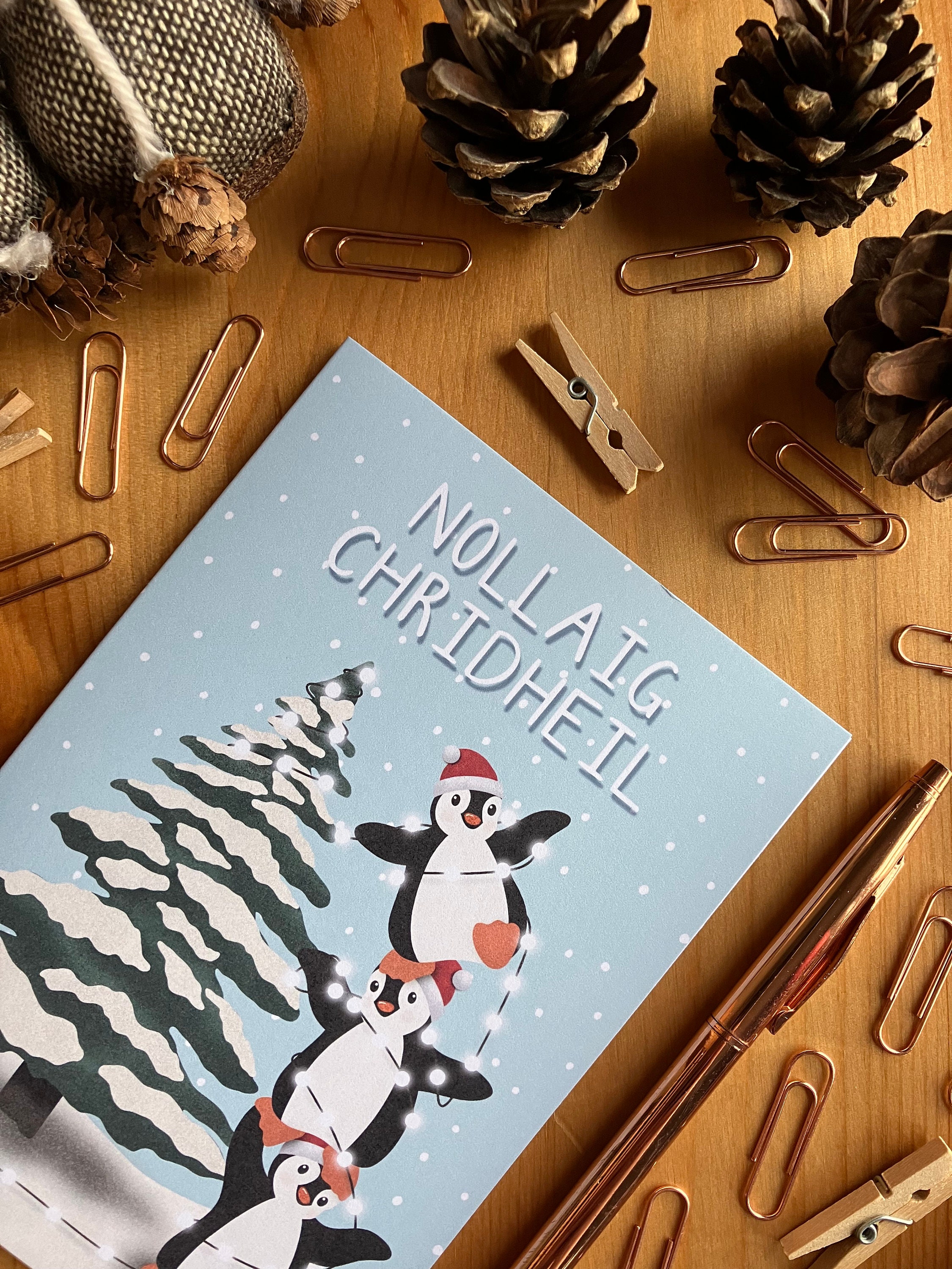 Nollaig Chridheil Scottish Gaelic A6 Blue Christmas Penguin Tree Christmas Card, Cute Illustration Christmas Card, Recycled Card, SH Designs