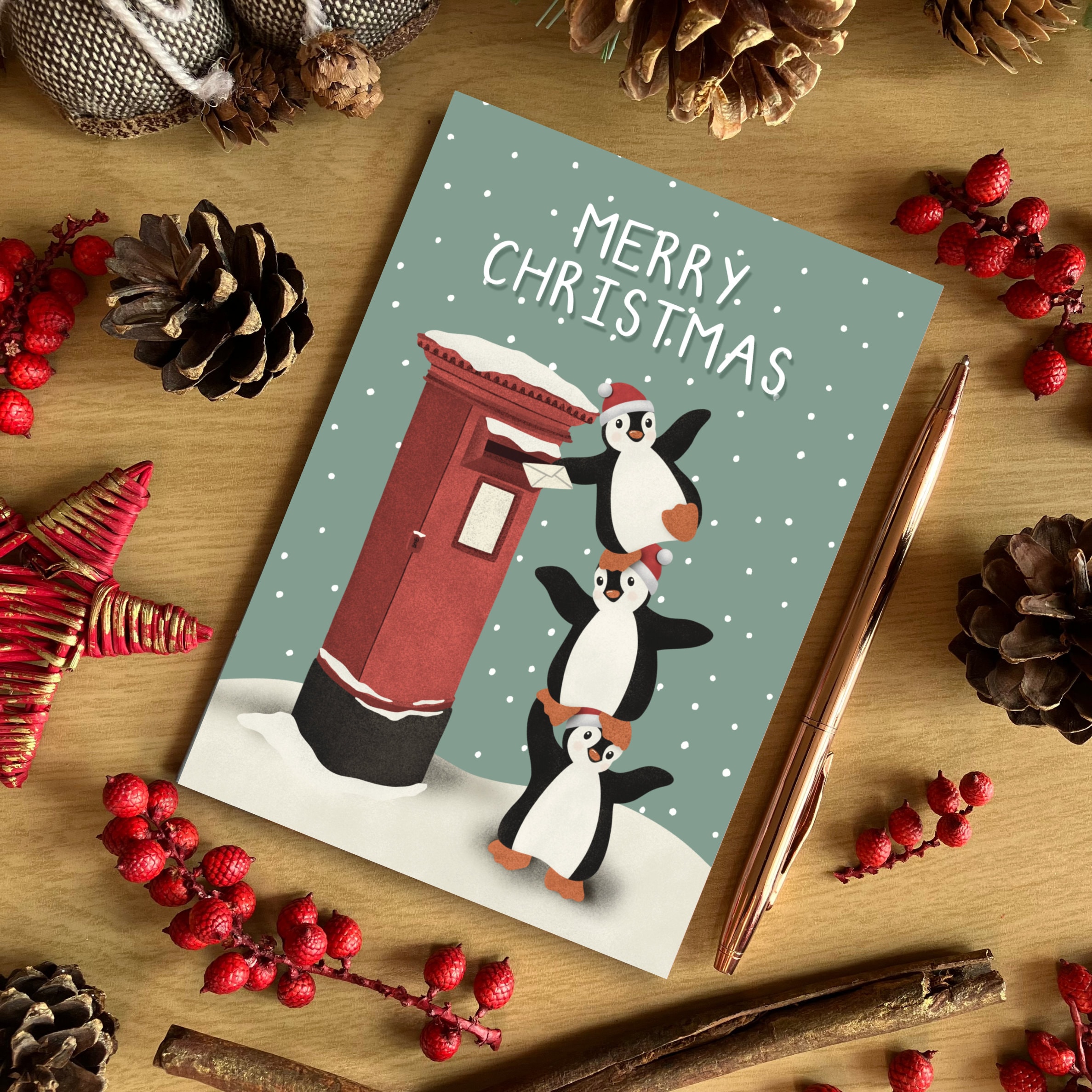A6 Green Christmas Penguin Post Box Christmas Card, Christmas Card, Cute Penguin Christmas Card, Recycled Card, SH Designs