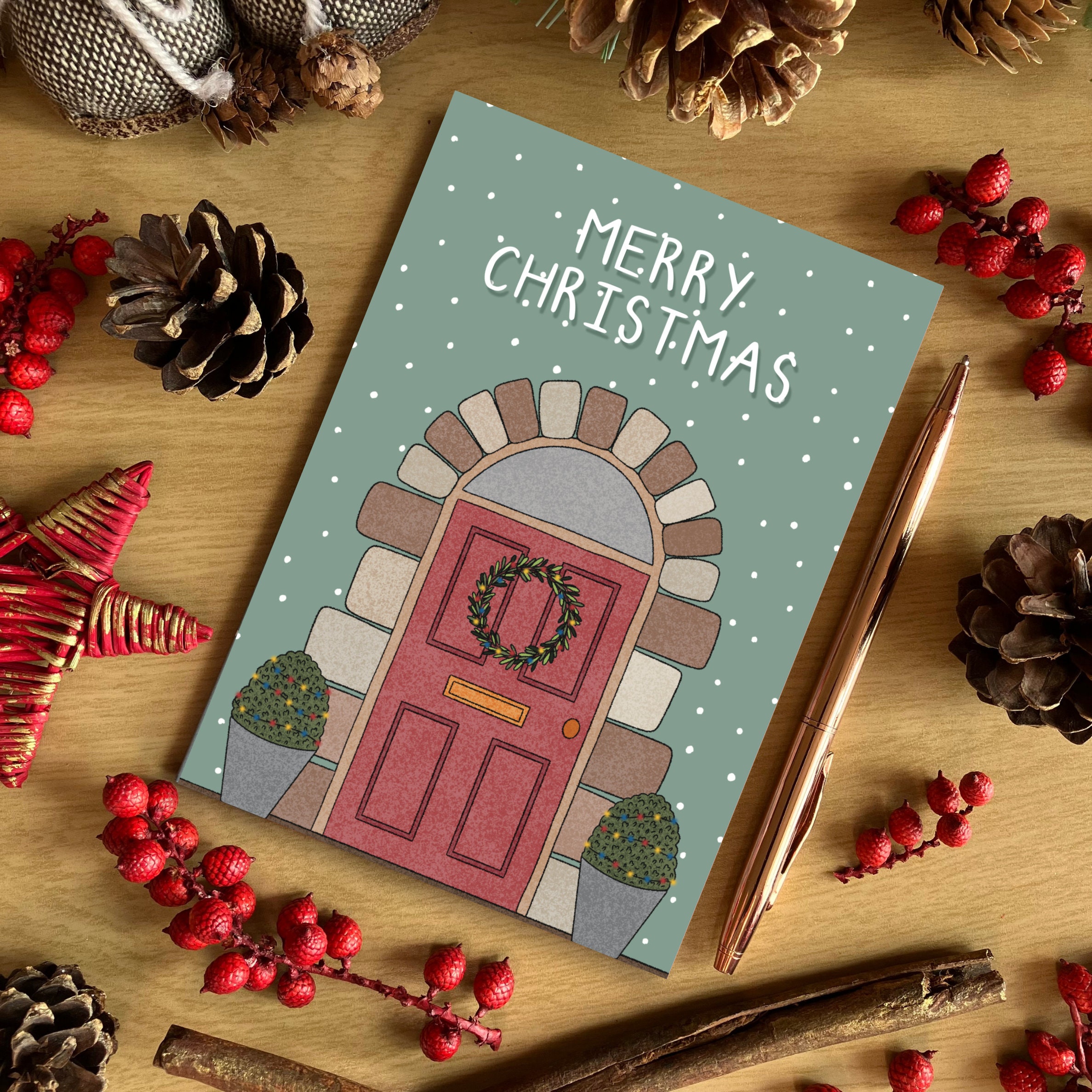 A6 Green Festive Front Door Christmas Card, Merry Christmas Card, Cute Illustrated Christmas Card, Recycled Card, SH Designs