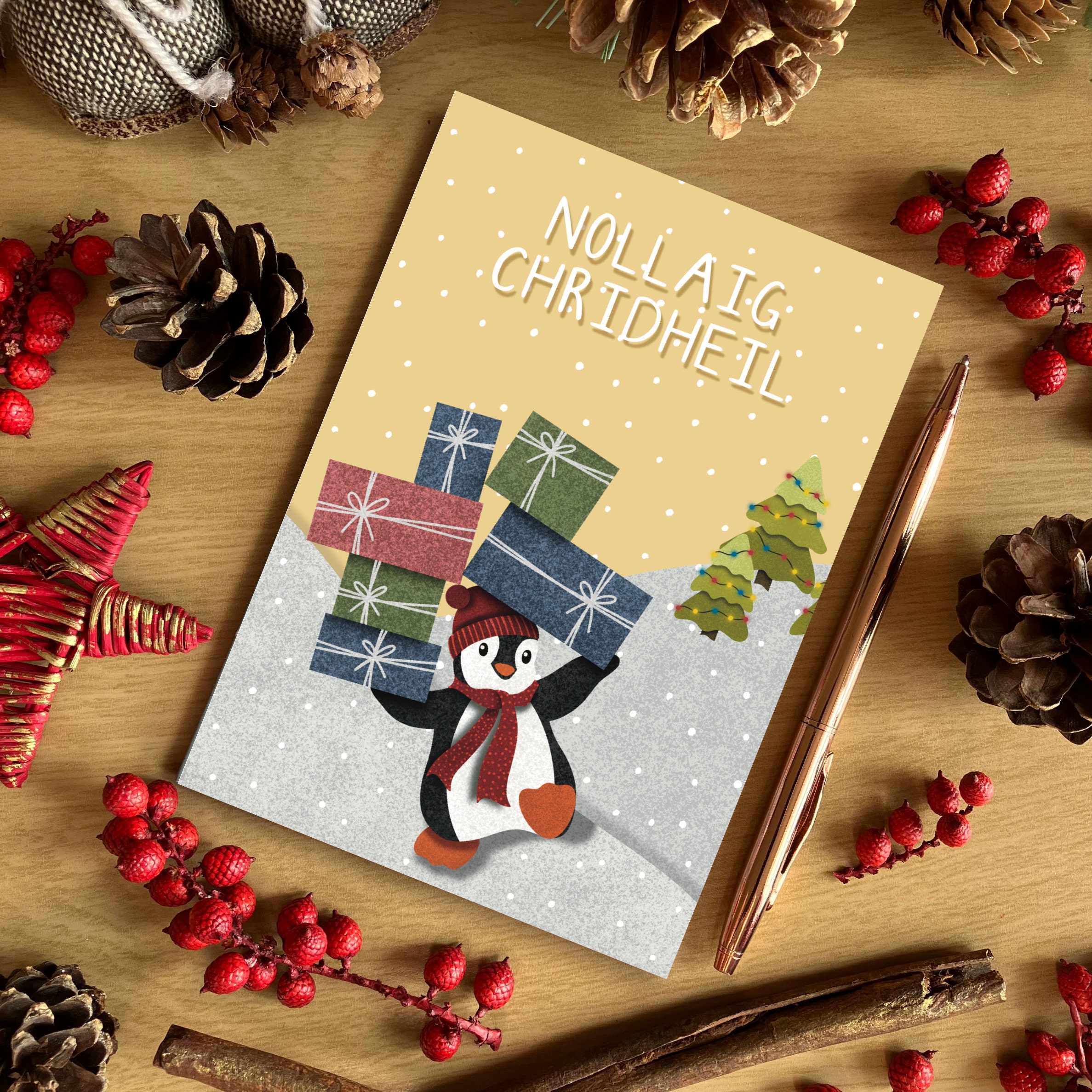 Nollaig Chridheil Scottish Gaelic A6 Yellow Christmas Penguin Presents Christmas Card, Scottish Card, Recycled Card, SH Designs