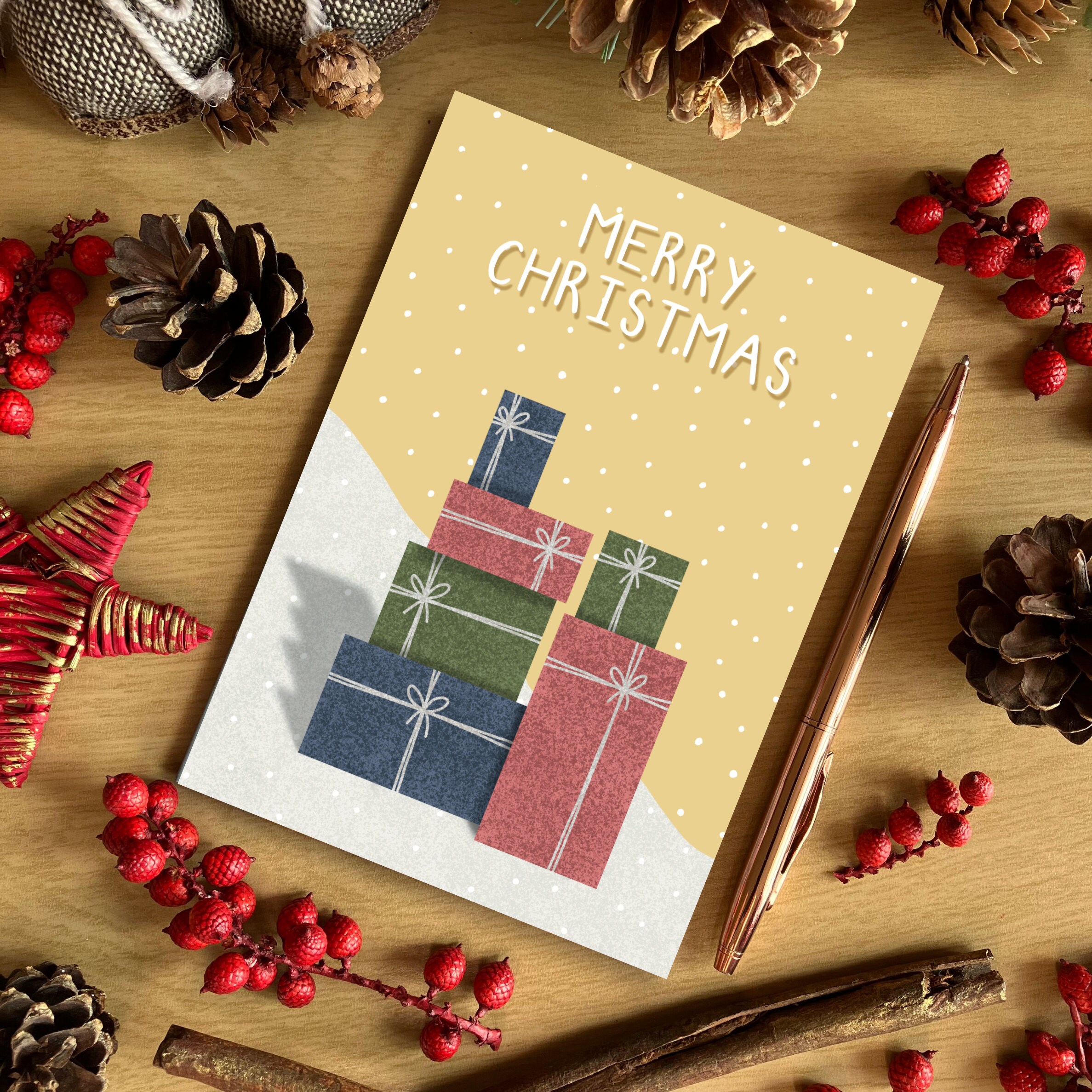 A6 Yellow Christmas Presents Christmas Card, Merry Christmas Card, Cute Penguin Card, Recycled Card, SH Designs